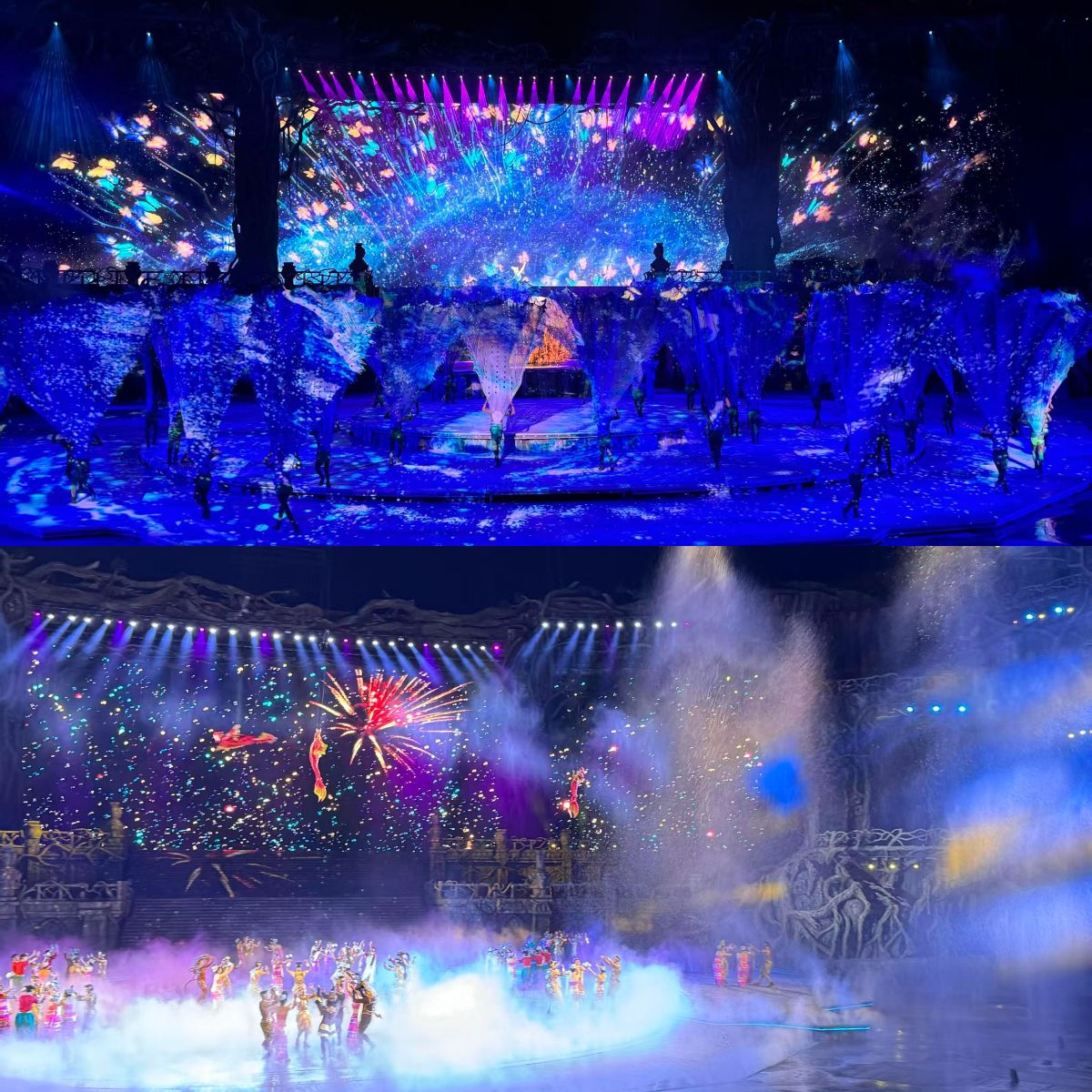 演出的舞臺堪稱視覺奇觀:14000 平方米的巨型舞臺依山而建,30 米高的實景瀑布奔騰而下,與 1200 平方米裸眼 3D 大屏交相輝映。270 度環幕將觀眾包裹其中,水陸空立體演繹讓孔雀公主的翩躚舞姿、雨林的蔥郁秘境近在咫尺,無需佩戴任何設備,便能感受神話場景破壁而來的震撼。當傣族非遺孔雀舞遇上現代光影技術,舞者靈動的 “三道彎” 身姿與裸眼 3D 呈現的孔雀羽翼交織,千年非遺在科技賦能下煥發新生,完美詮釋了東方美學的獨特韻味。
